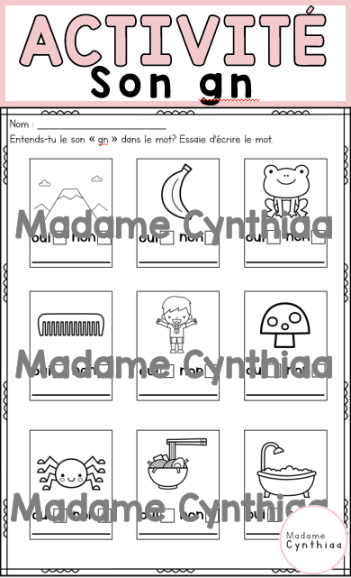 Feuille très simple dans laquelle l'élève doit indiquer s'il entend le son 'gn' dans le mot.